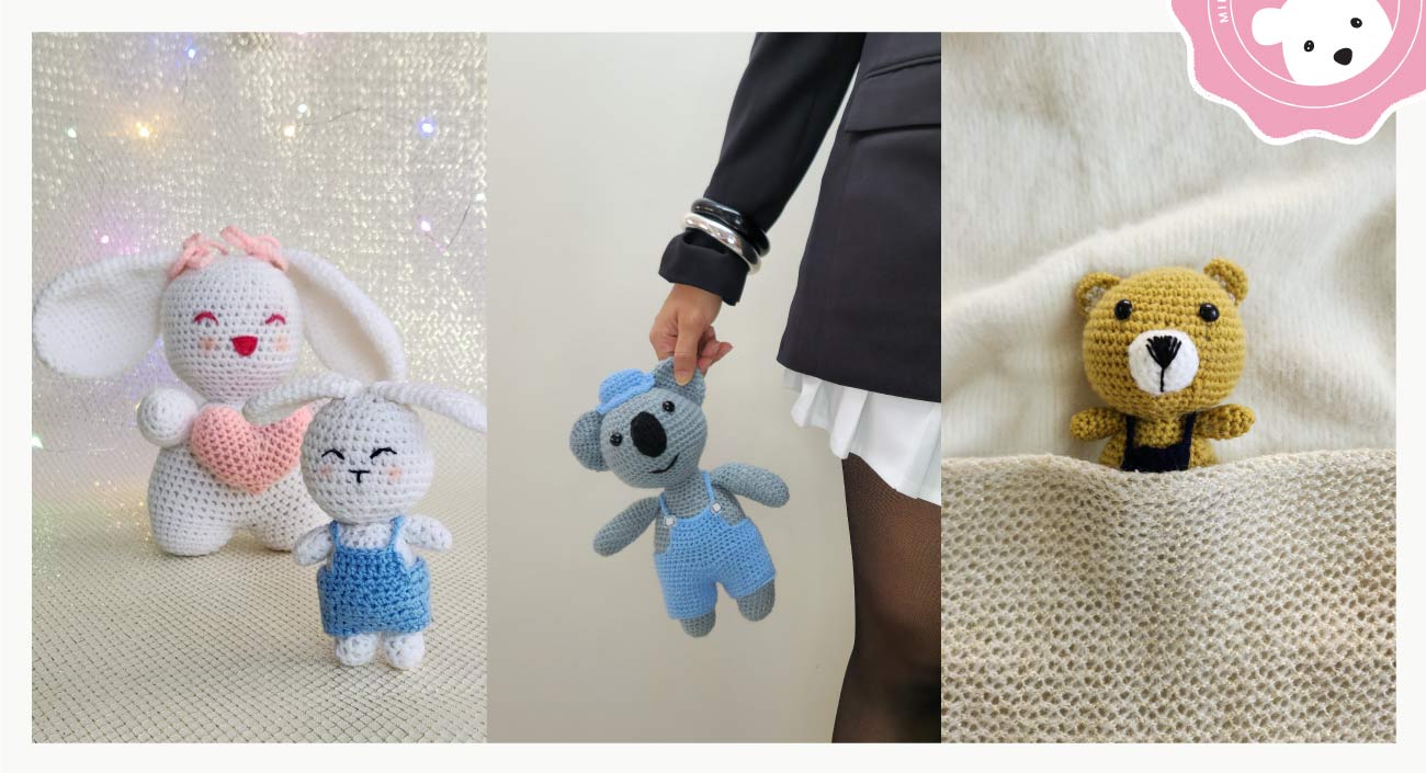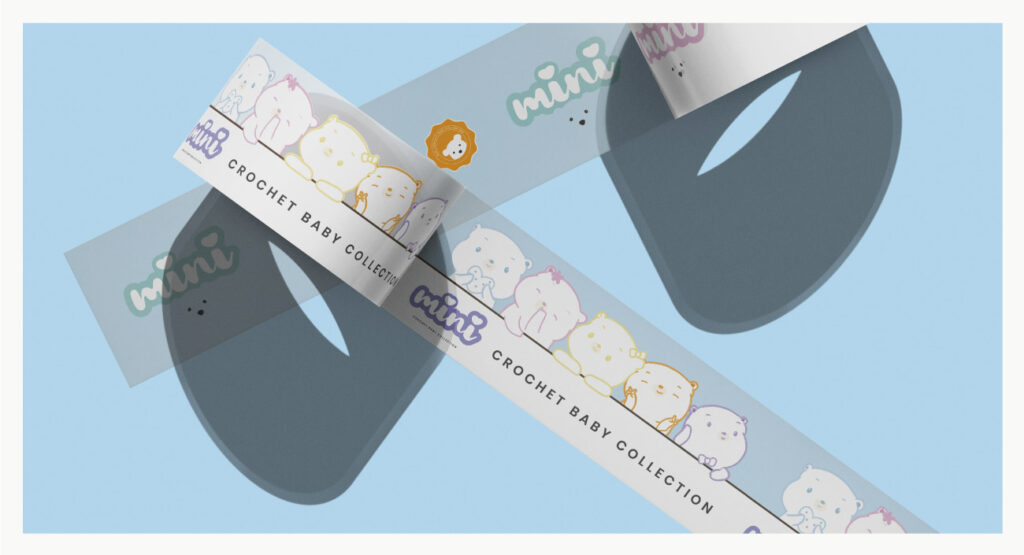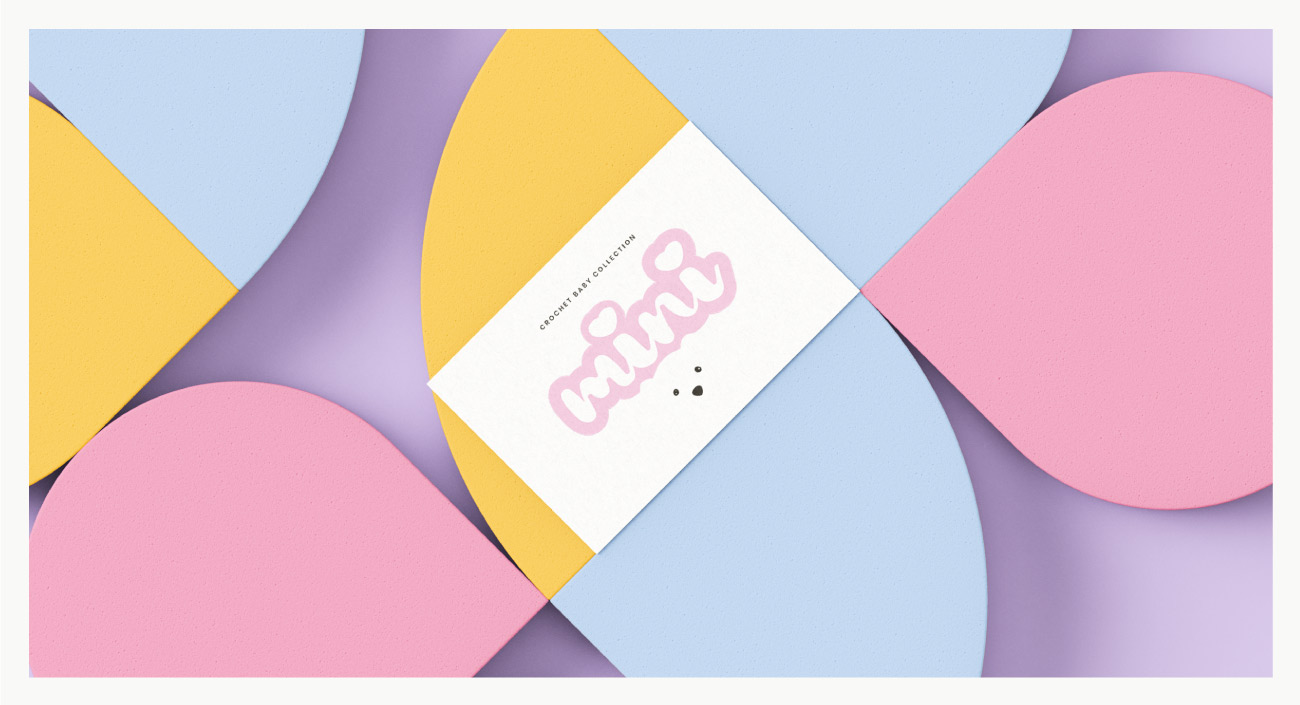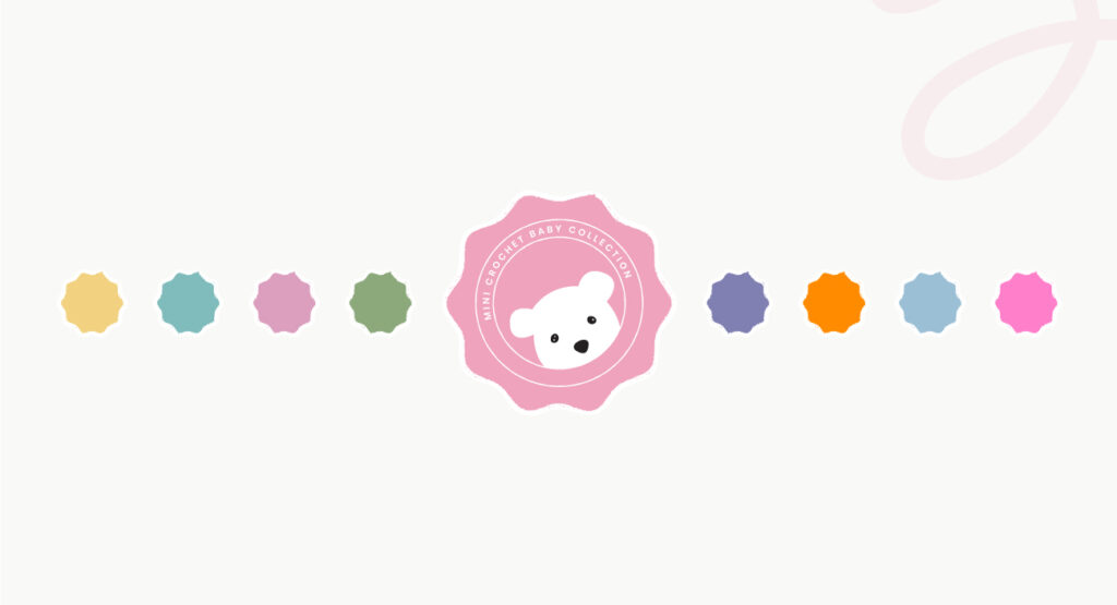 Mini Crochet Baby Collection branding is designed to be soft, playful, and cozy, reflecting the handmade, heartfelt nature of the products. The logo features a bubbly, hand-drawn script with heart details complemented by a minimalist bear face to create a baby friendly and inviting aesthetic.